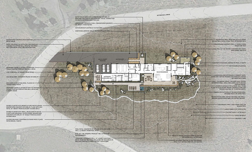 Throughout the site, informal footpaths wind through curated plantings and naturalized areas, offering moments of discovery and glimpses of the distant Sawtooth Mountains. A highly site-specific plant palette begins with structured monocultures near the home and transitions to native shrubland and revegetated zones, all established using seeds and starts collected directly from the site—underscoring the deep commitment to site-driven design.
